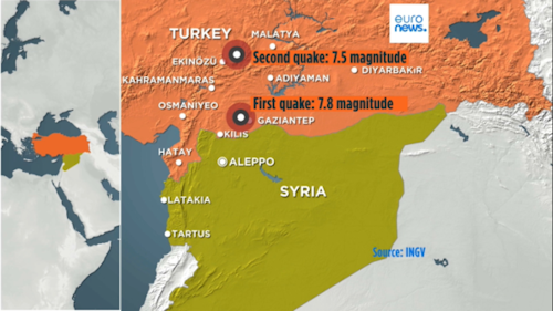 O primeiro terramoto de 7,8 magnitude, registado às 04:17 locais (menos três horas em Lisboa) teve o epicentro no sudeste da Turquia e afetou o noroeste da Síria. Foi sentido em diferentes partes do Médio Oriente e registado inclusivamente em Portugal.